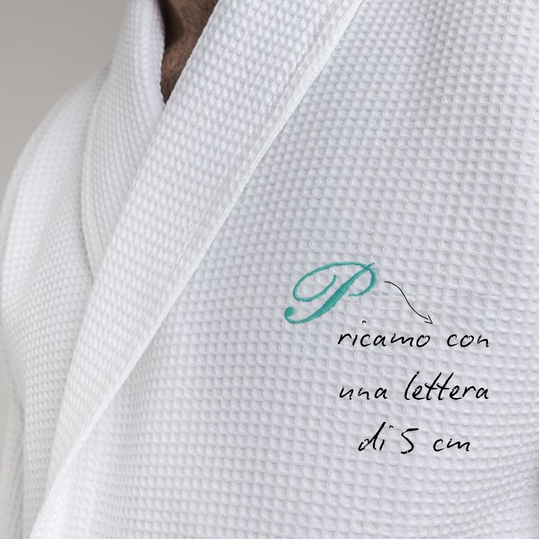 Part of the Cifrati collection, this bathrobe features an embroidered initial of your choice, positioned on the left chest (heart side).